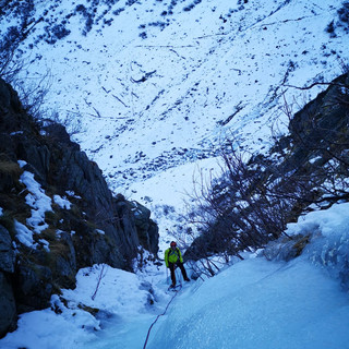 Andiamo all'attacco con Luca e Matteo conosciuti al parcheggio. Loro attaccano a dx e noi a sx per lasciare a loro la precedenza e evitare scariche di ghiaccio. Dopo una ravanatatra ci accorgiamo subito di tratti di ghiaccio bagnato e sulla capoccia ci sono dei bei "festoni" carichi di acqua e ghiaccio non molto rassicuranti.